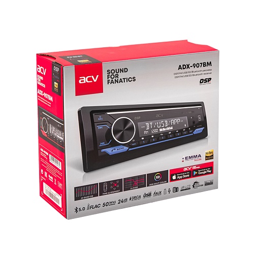 Автомагнитола DSP/FM/USB/SD/Bluetooth ACV ADX-907BM DSP ресивер с высокопроизводительным звуковом процессором оригинальной разработки ACV Soundstone DSP-SS1 и 3 парами 4 вольтовых RCA аудиовыходов. Оснащен встроенным усилителем с максимальной мощностью 4х50 Вт. Поддержка FLAC 24bit 96kHz.
