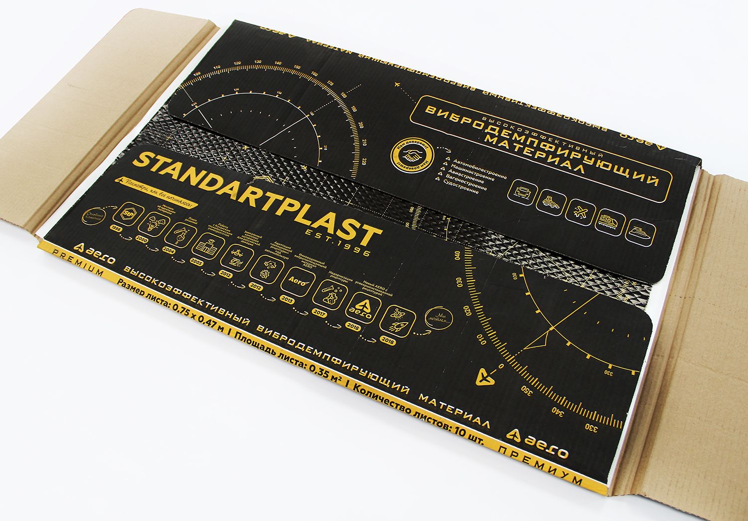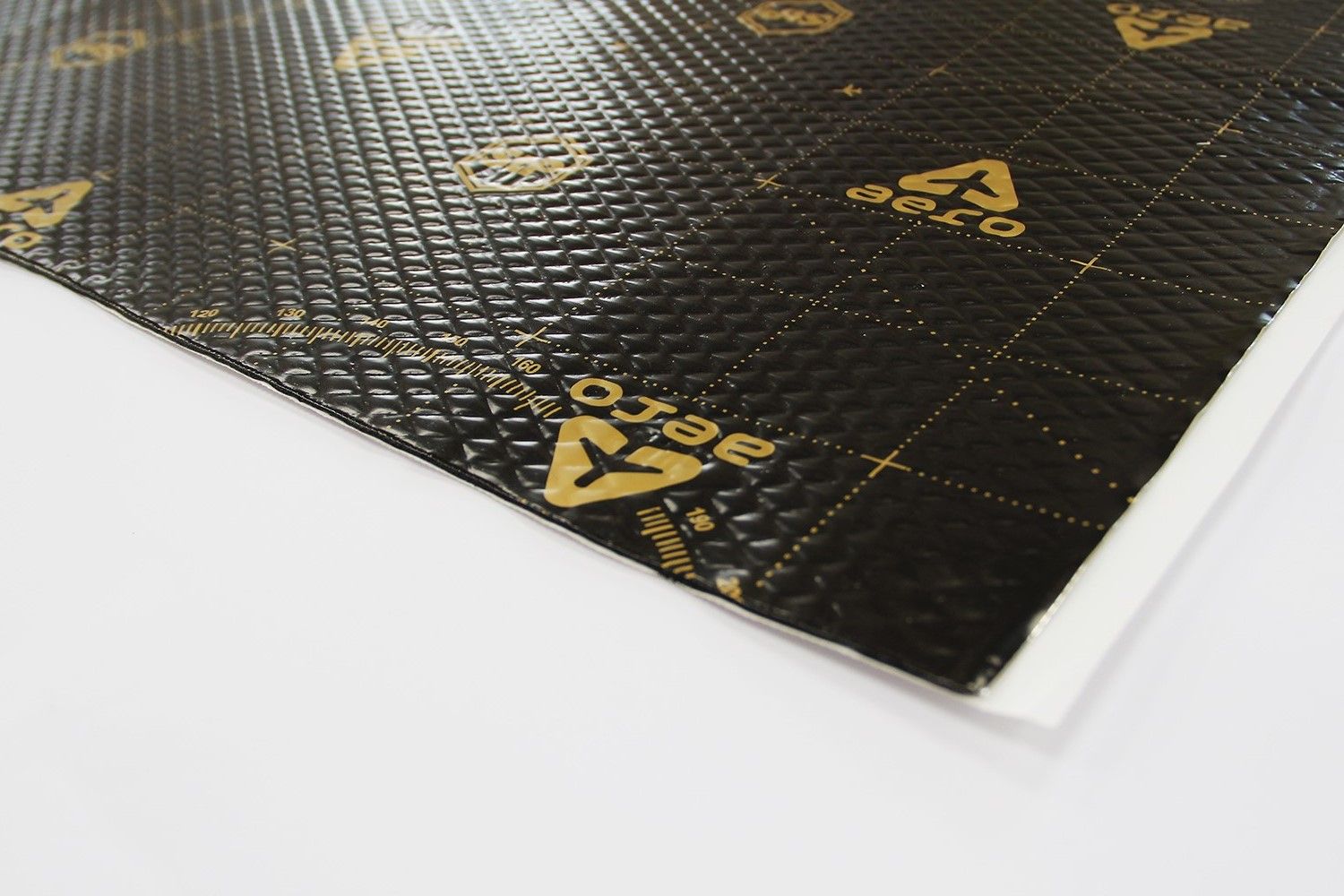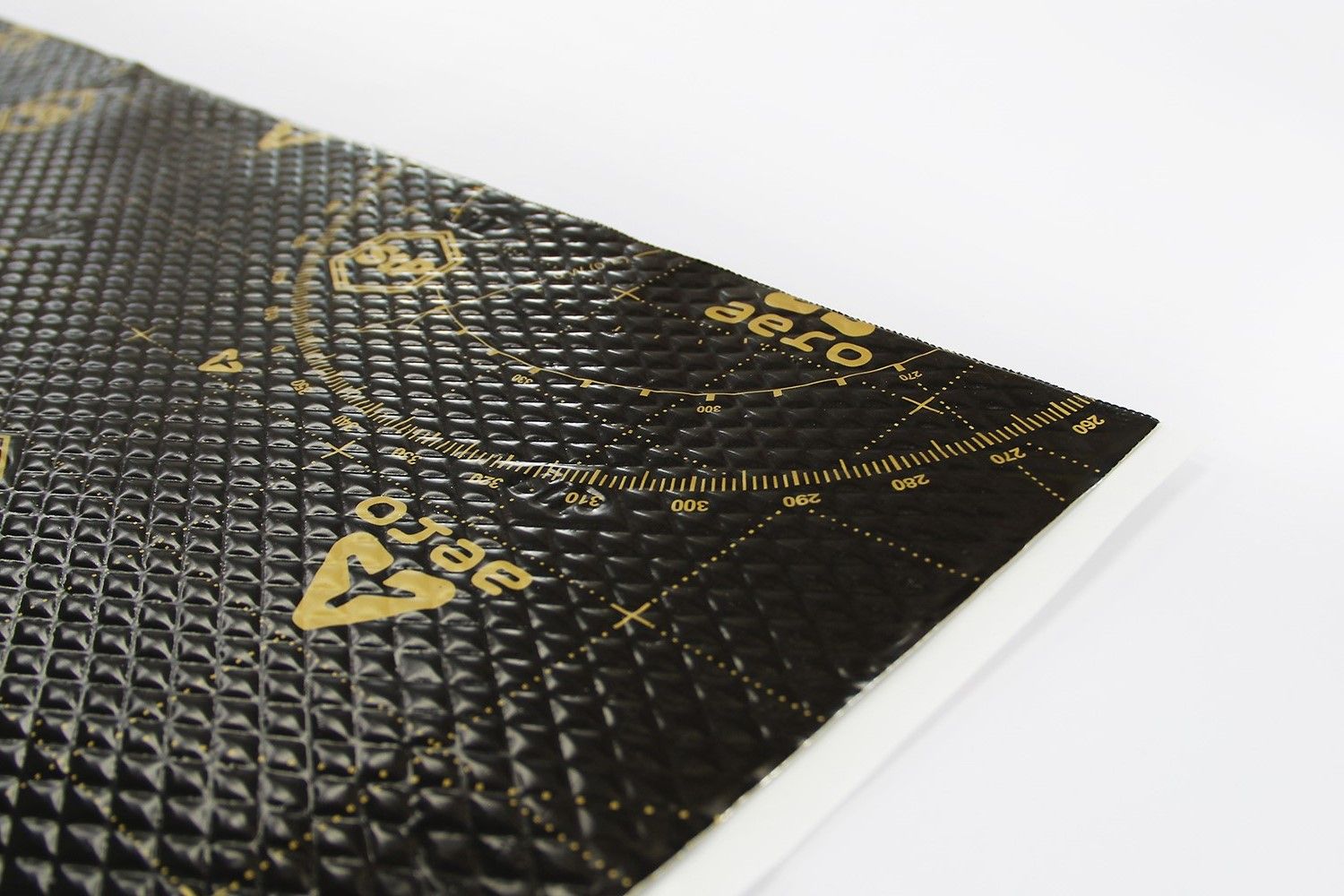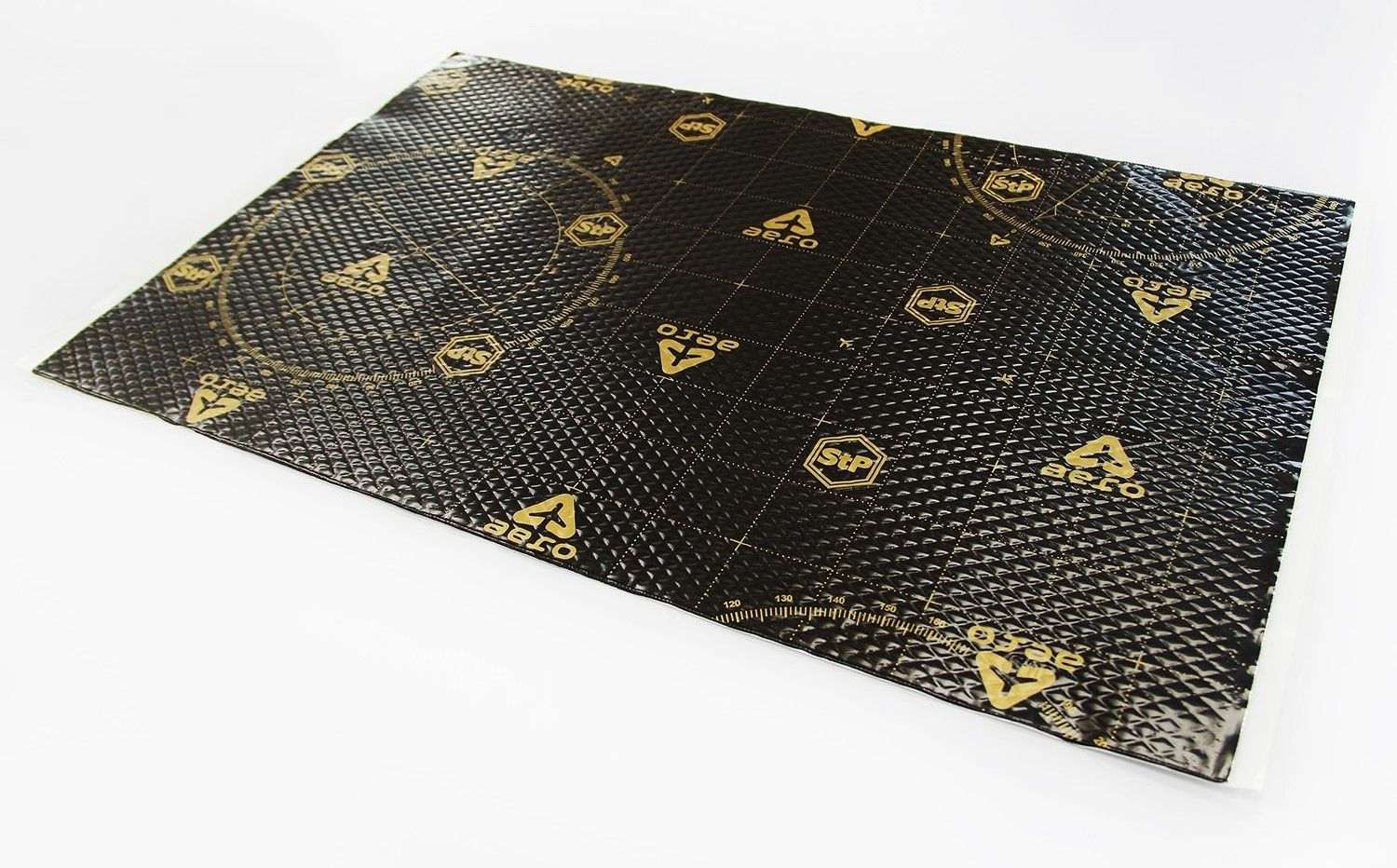 StP Aero: вибропоглощающий мастичный материал на основе LIGHT рецептуры. Лицевое покрытие: фольга черного цвета и тиснением «чешуя», на покрытии имеется печать золотого цвета с логотипом StP Aero.